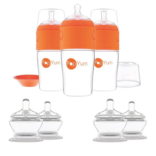 PopYum Orange 7 Piece Bundle: 9oz Bottle 3-Pack + 2 Nipple 2-Packs